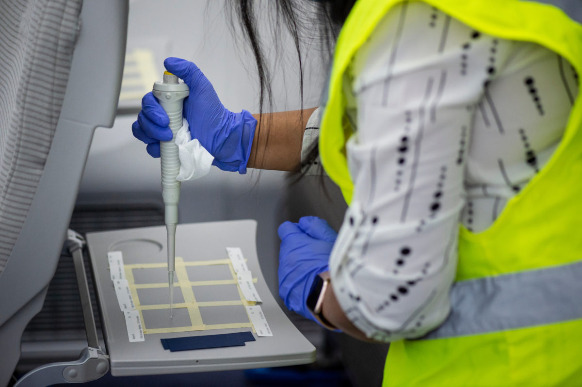 The study placed MS2 at strategic high-touch points throughout the cabin, including on seat tray tables, arm rests, seat cushions, stowage bins and inside the lavatory and galley. Technicians disinfected each area with various products and technologies. Chemical disinfectants were applied through two means: manual wiping and with an electrostatic sprayer, a device that applies a fine spray of an approved liquid disinfectant. The tests also measured how well Boeing’s ultraviolet wand and antimicrobial coatings worked. Antimicrobials are long-lasting coatings that destroy germs and viruses on surfaces.
